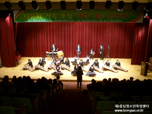 2010 세계청소년자원봉사주간 행사 4346 | 최고관리자 | 2010-05-10 (재)충청남도청소년육성센터 활동지원실에서는 매년 세계청소년자원봉사주간을 기념으로 행사를 실시하고 있습니다. 2010년도에 지원사업으로 진행하였으며, '충청남도남부평생학습관', '예산중학교', '서일고등학교', '충남예술고등학교' 4개기관이 선정되어 다문화 봉사활동을 주제로 4.12(월)~4.25(일) 2주간 행사를 진행하였습니다.