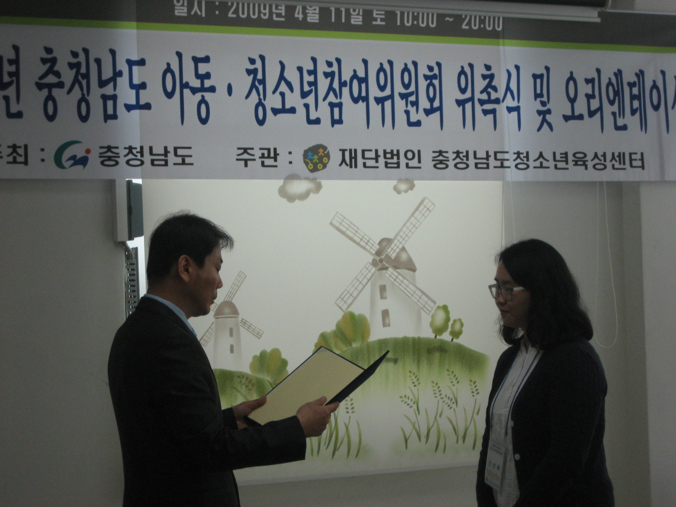 2009년 충청남도 아동·청소년참여위원회 위촉식 및 오리엔테이션 4590 | 최고관리자 | 2009-04-14 지난 4월 11일 토요일 2009년 충청남도 아동·청소년참여위원회 위촉식 및 오리엔테이션이 있었습니다.청소년이 함께하는 세상 충남의 참여위원회 위원들이 시작하겠습니다.지켜봐주시고 응원해 주세요~
