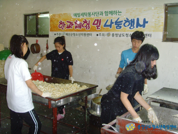 청소년활동우수프로그램지원사업 '미소나누미' 4021 | 최고관리자 | 2011-09-26 9월 24일에 있었던 청소년활동 우수프로그램 지원사업 '미소나누미'의 활동 사진입니다. 이번활동은 한과공장을 방문하여 한과를 만들고 이웃 어르신들께 전달해 드리는 활동이었습니다.