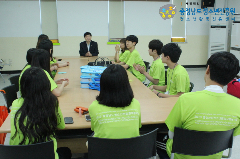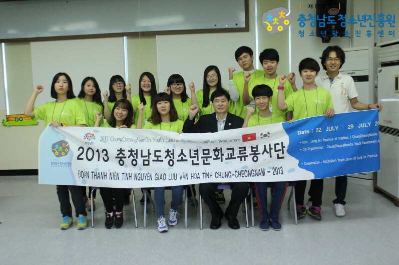 2013년 충청남도청소년문화교류봉사단 출발! 4440 | 최고관리자 | 2013-07-30 2013년 충청남도청소년문화교류봉사단이 7월 22일 베트남 롱안성으로 떠났답니다 ^^바쁜 와중에도 틈틈히 모여서 많은 준비를 한 우리 봉사단 친구들 이제 실력을 발휘하러 출발~!몸 조심히 다녀오고 베트남친구들과 좋은 추억 많이 만들고 오길 바래요~