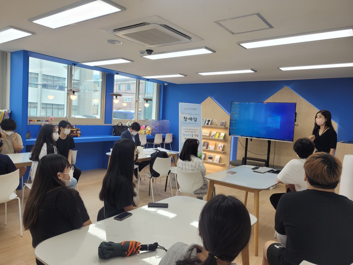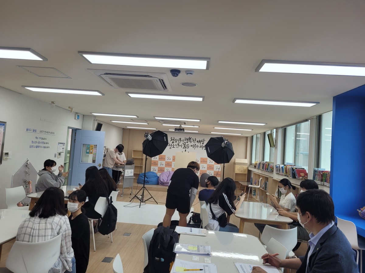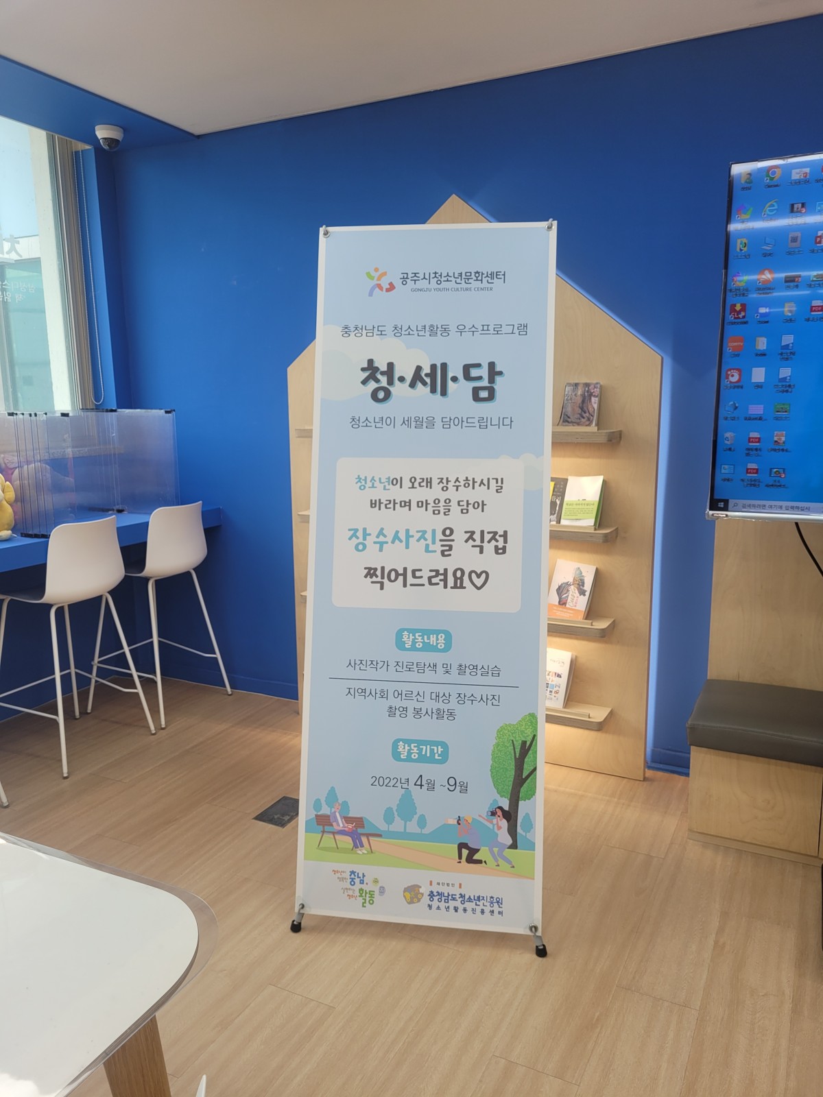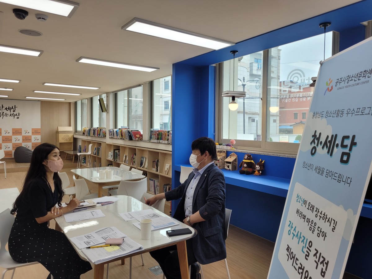 충청남도 청소년활동 우수 프로그램 전문가 현장 컨설팅(공주시청소년문화센터) 1882 | 활동진흥센터 | 2022-07-28 충청남도 청소년활동 우수 프로그램 '청.세.담.(청소년이 세월을 담아드립니다.)' 전문가 현장 컨설팅이 7.23.(토) 공주시청소년문화센터에서 진행됩니다. '청.세.담.(청소년이 세월을 담아드립니다.)' 는 청소년과 어르신이 프로그램을 매개로 모여 함께 활동함으로써 세대 간 소통 및 교류를 하고자 합니다. 그래서 청소년들이 지역 내 사진작가를 통해 진로탐색을 하고, 촬영실습을 통한 기본적인 기술을 습득하여 나아가 지역사회 어르신을 대상으로 장수사신 촬영을 하는 봉사활동 프로그램 입니다.