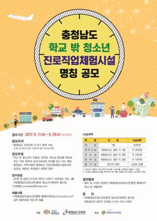 [천안신문] 재단법인 충청남도청소년진흥원(원장 장기수)은 충남도청과 충남교육청의 교육상생협력사업의 일환인 '학교 밖 청소년 진로직업체험시설'의 명칭을 공모전을 통해 선정한다고 밝혔다.