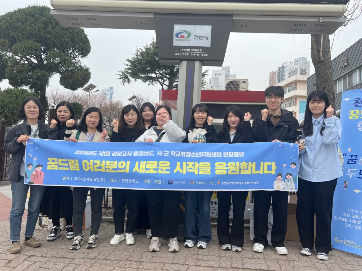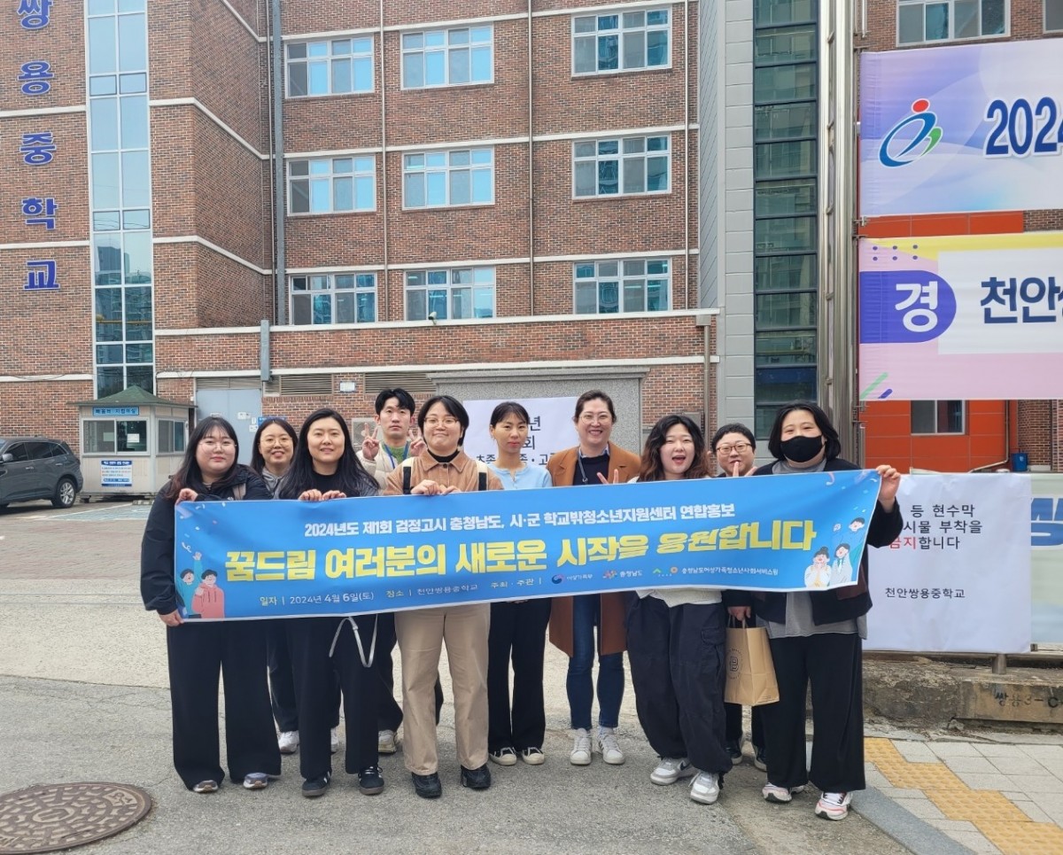 [천안=뉴스충청인] 충남여성가족청소년사회서비스원(원장 조경훈) 학교밖청소년지원센터는 6일(토) 2024년 제 1회 초등학교‧중학교‧고등학교 졸업학력 검정고시 고사장인 천안중학교, 천안가온중학교, 천안쌍용중학교를 방문했다. 검정고시에 응시한 청소년 및 보호자, 지역주민등을 대상으로 학교밖청소년지원센터 프로그램 안내 및 연합 홍보를 실시했다.