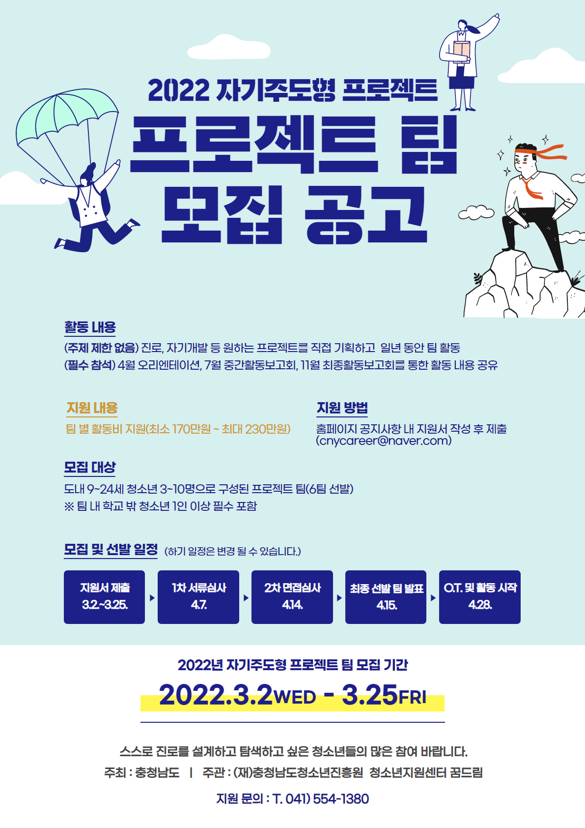 충청남도에 거주하는 9~24세의 청소년 3~10인으로 구성된 팀(학교 밖 청소년 1인 이상 포함)이 대상으로 활동 계획 및 활동비 지출계획 등을 고려해 6개 팀이 선정되며 희망 활동비를 고려해 최종 지원금이 산정된다.
