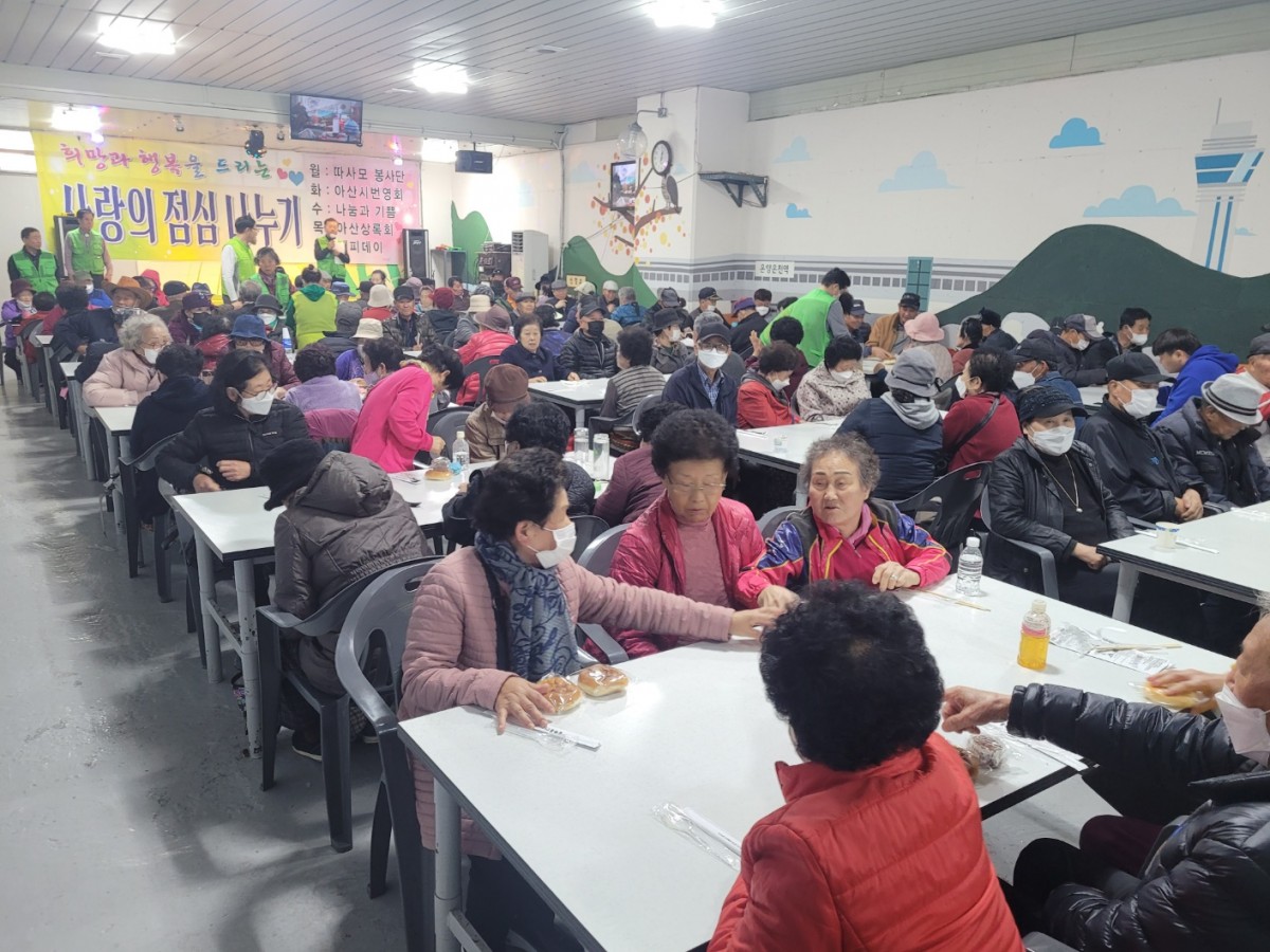 이번 사회환원활동은 온양온천역 하부 아산경로 무료급식소를 방문해 직접 만든 빵 340개를 전달 하였다. 이날 무료 급식소에는 어르신 180여 명이 모였다.