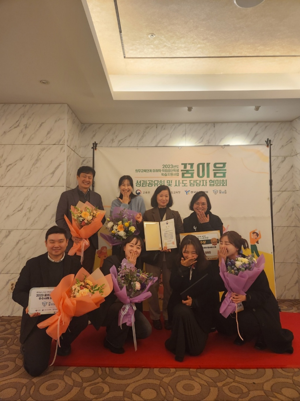 교육부와 16개 시·도교육청이 주최하고 한국교육개발원이 주관하는 2023년 「꿈이음 성과공유회 및 공모전 시상식」에서 충남여성가족청소년사회서비스원 학교밖청소년지원센터가 프로그램 우수사례 부문 최우수상(부총리 겸 교육부장관상)을 수상하였습니다. 최우수상을 받은 '꿈틀'프로그램은 학습 플래너를 개발, 보급하여 자기주도 학습을 유도하고, 독서챌린지 활동을 통해 청소년의 문해력을 향상시켰다는 좋은 평가를 받았습니다.