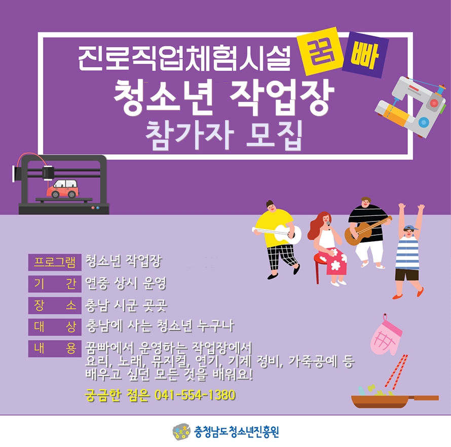 진로직업체험시설 꿈빠 청소년 작업장 참가자 모집 대상 2018-07-30 분야 0/1 교육기간 2018-08-01 ~ 2018-08-01 접수기간 2018-07-30 ~ 2018-07-31 장소 OFF 교육비 2018-07-31 정원 0/1 상태 마감 목록 상세내용 진로직업체험시설 꿈빠 청소년 작업장 참가자 모집합니다.