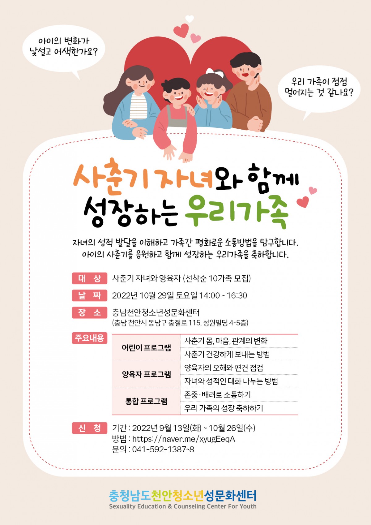 2차 사춘기 가족캠프 진행안내 2058 | 천안성문화센터 | 2022-10-14 2차 사춘기 가족캠프 진행 안내천안성문화센터에서는 사춘기 자녀를 포함한 가족 캠프를 진행합니다.관심있는 가족의 많은 참여 부탁드립니다.