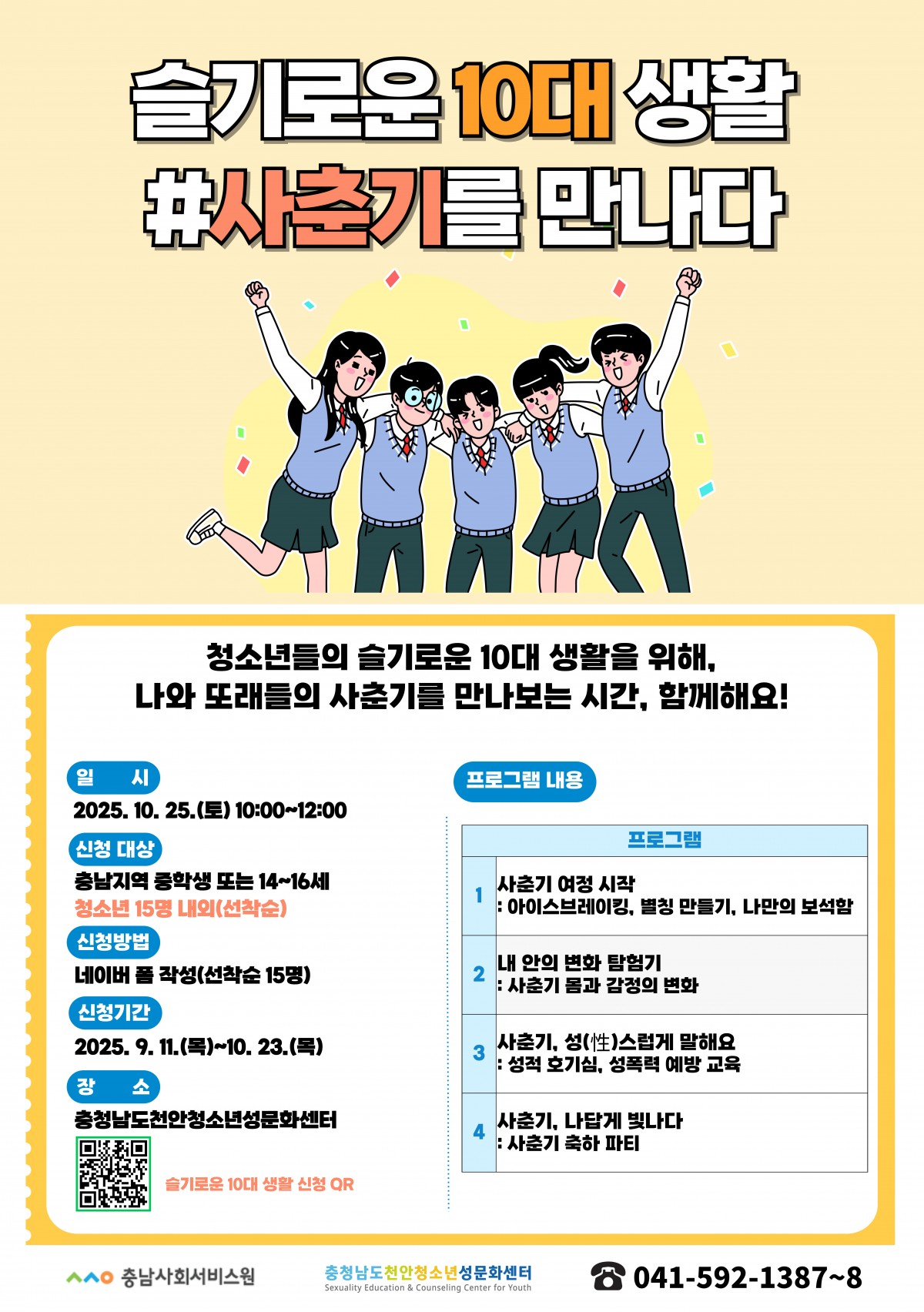 - 대상: 충남 지역 14~16세 청소년 또는 중학생 (15명 내외 / 선착순 모집)