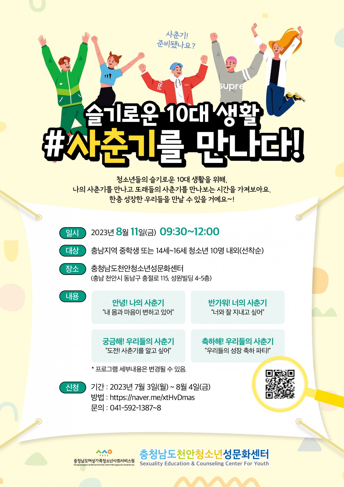 슬기로운 10대 생활 #사춘기를 만나다! 1429 | 천안성문화센터 | 2023-06-19 https://naver.me/xtHvDmas + 2599 https://naver.me/xtHvDmas + 2627 충남 지역 내 중학생의 신청을 기다립니다!위 링크를 클릭하시면 네이버 폼 신청서로 연결됩니다.* 조기 마감될 수 있습니다.