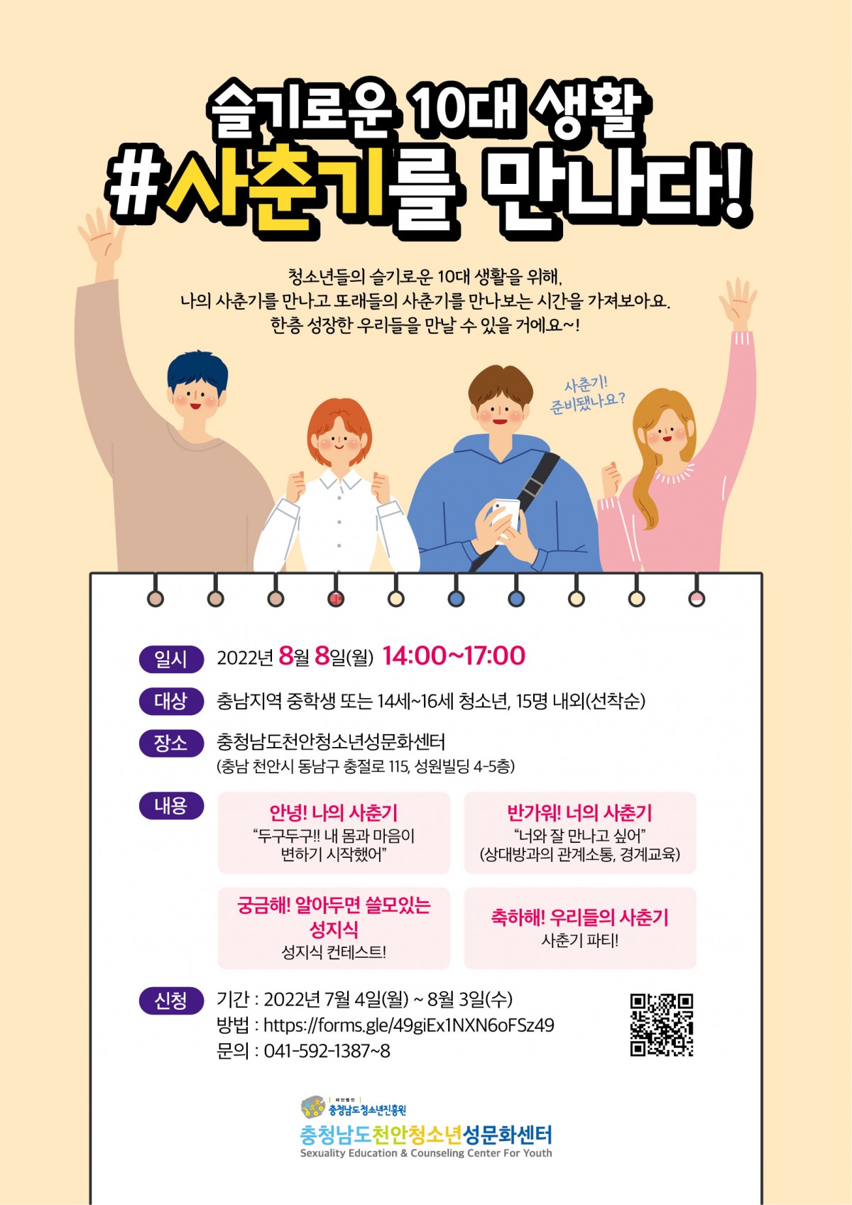 충남천안청소년성문화센터 <슬기로운 10대생활 #사춘기를 만나다> 캠프 참여자 모집안내
