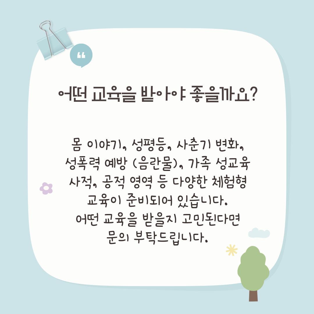 특수아 성교육 카드뉴스 (안내) 45 | 천안성문화센터 | 2025-12-16 https://say1388youth.or.kr/bbs/board.php?bo_table=say_b501&wr_id=43 + 26 특수아 성교육 카드뉴스 (안내)