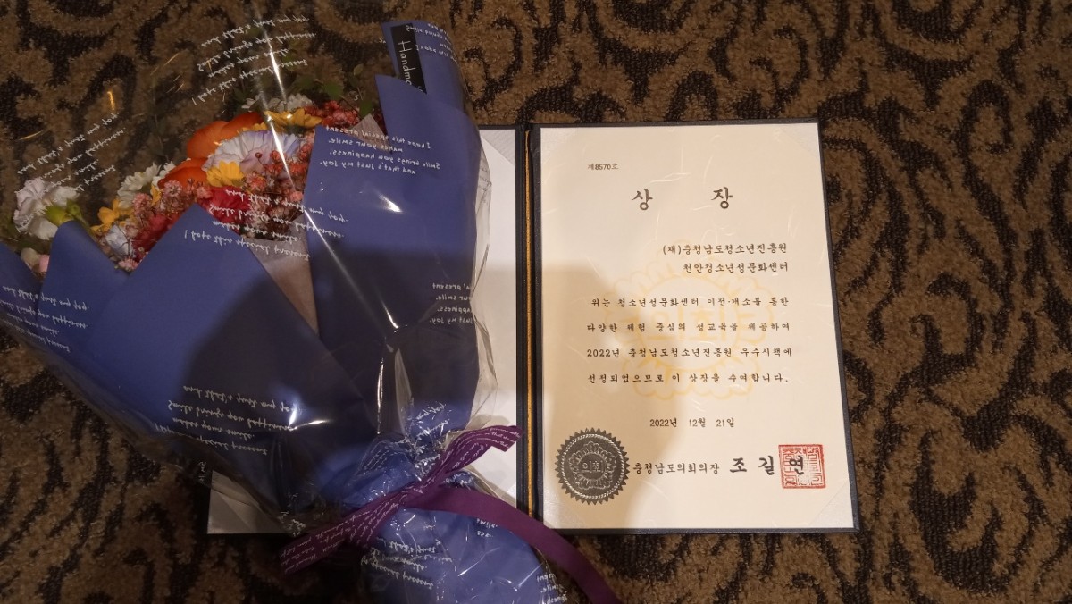 충남청소년성문화센터 '정책성과 보고대회-충남도의회의장상 수상!! 1701 | 천안성문화센터 | 2022-12-21 충남청소년진흥원 '정책성과 보고대회'에서 천안 성문화센터가 충남도의회 의장-(우수시책) 상을 받았습니다.올 한해 부족한 인원으로 모두 고생한 임직원들에게 뜻깊고 보람된 상이 되었습니다.감사합니다.수고하고 애쓴 모두에게 올 한해 감사의 인사를 드립니다.송구영신 하십시요!!