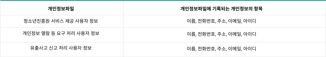 ② 『충청남도청소년진흥원』는 개인정보 열람, 정정·삭제, 처리정지 요구 민원을 처리하기 위하여 민원 신청인의 개인정보를 개인정보파일 보유기관이 열람할 수 있도록 하고 있습니다.